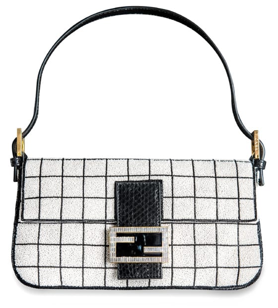 La maison Fendi s’est inspirée des escalators du Bon Marché, pour créer ce sac « Baguette » en toile broderie canottiglie avec boucle fermoir en Swarovski Elements et émail noir pour 3140€.