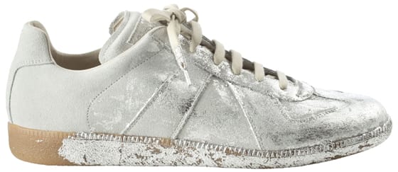 Maison Martin Margiela avec ces baskets homme en cuir avec application d’une feuille argentée à 350€.