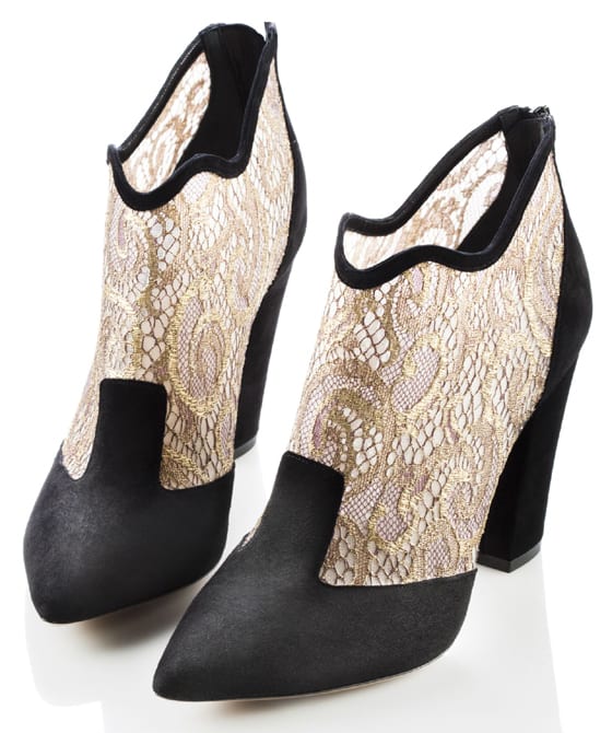 Le nouveau jeune prodige de la chaussure, Nicholas Kirkwood, propose une bottine en veau velours et dentelle à 800€.