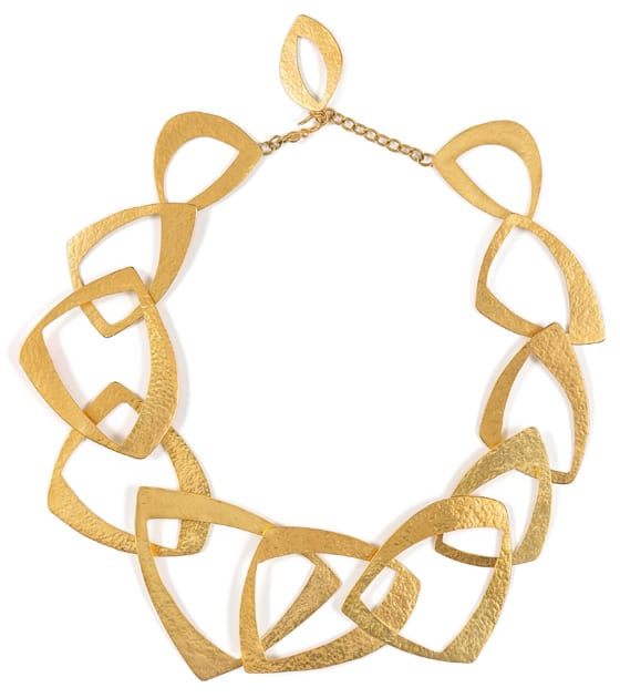 Le bijoutier Hervé Van Der Straeten avec un collier en laiton martelé à la main, doré à l’or fin pour 700€.