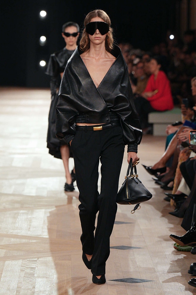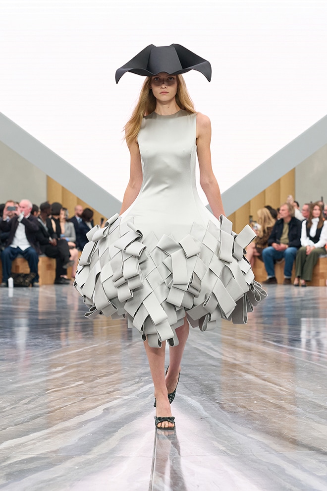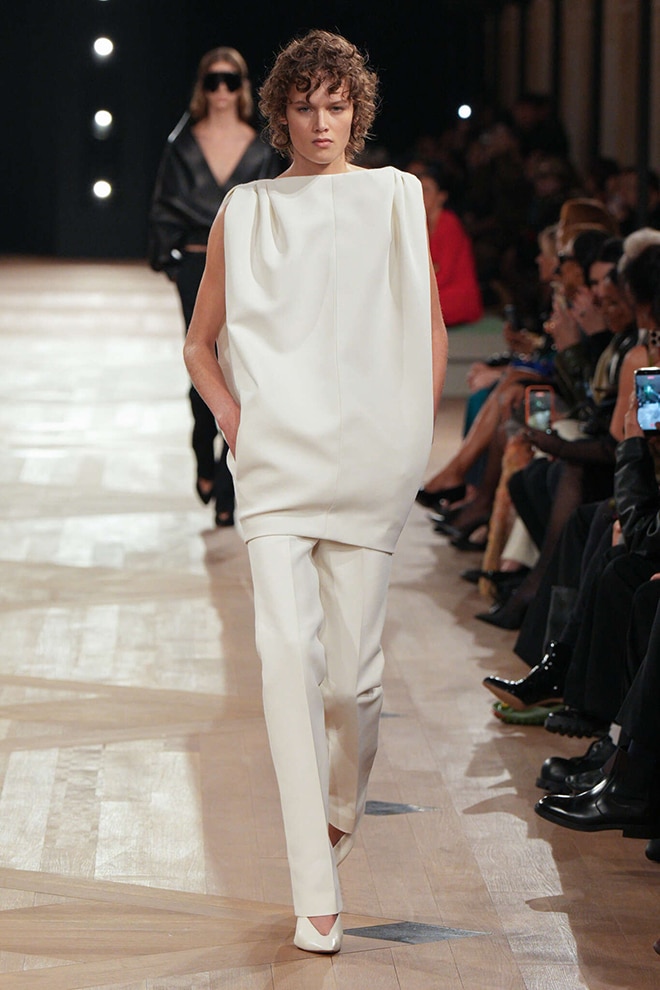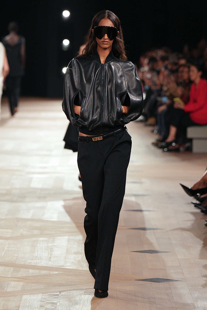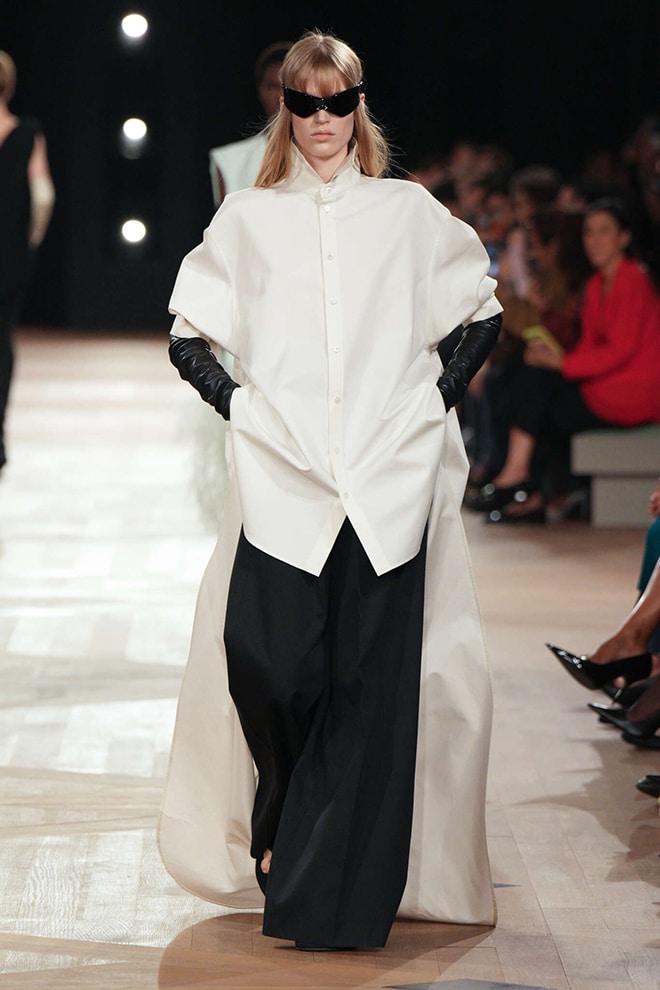 Le créateur redonne à Balenciaga un souffle couture, sans pour autant nier l’héritage de son prédécesseur, perceptible à travers des détails comme les lunettes-masques ou certaines coupes futuristes.