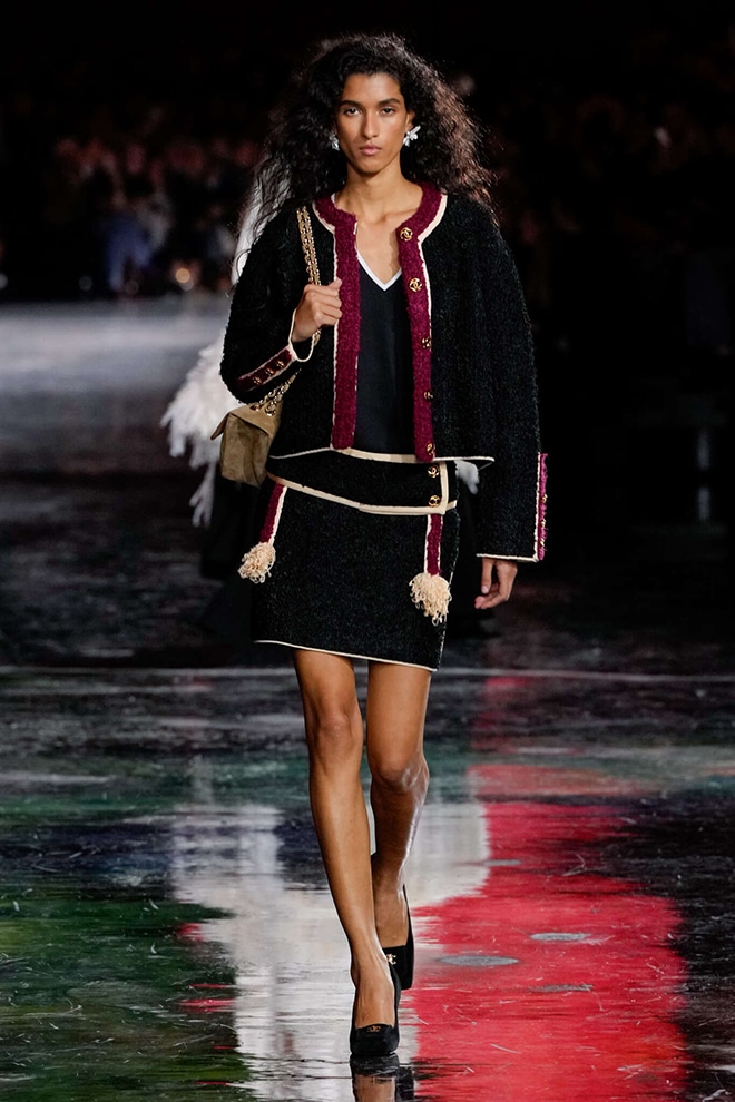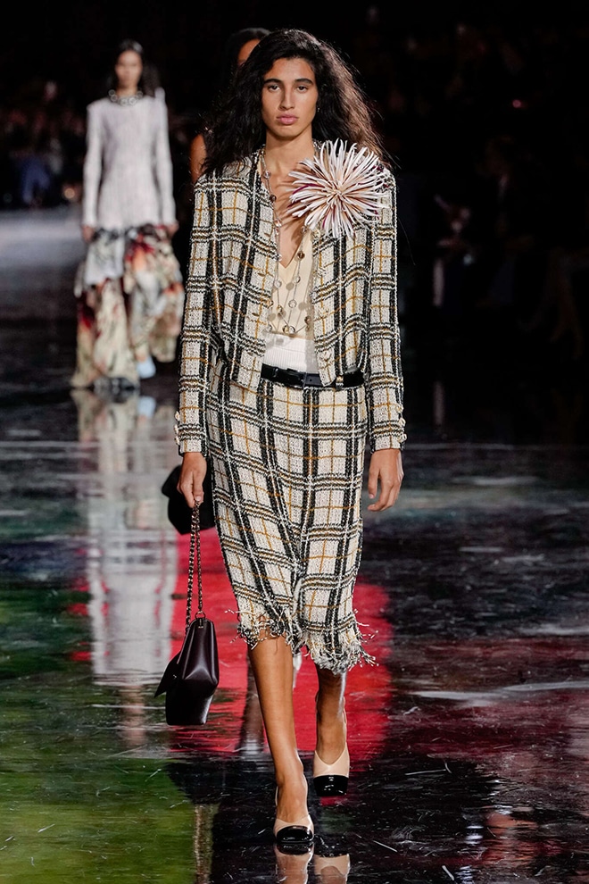 Il en résulte une collection moins immédiatement “Chanel” dans son esthétique, où le vêtement reprend le devant de la scène et où les accessoires s’effacent avec subtilité. Si le tweed demeure un fil conducteur, il s’efface au profit de tailleurs-pantalons empruntés au vestiaire masculin – clin d’œil élégant à la passion de Gabrielle Chanel pour les vêtements d’homme.