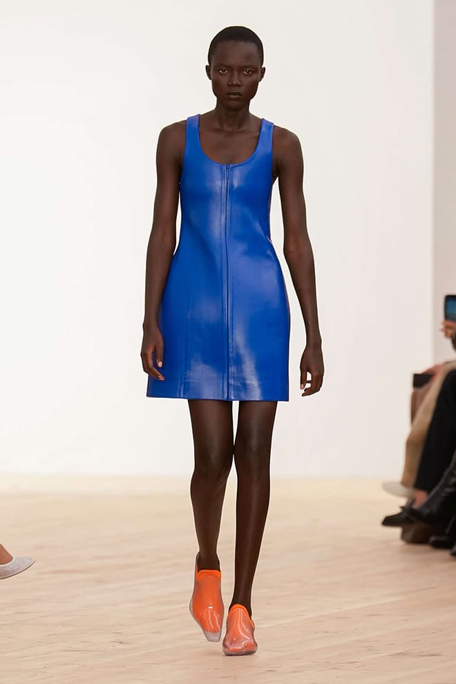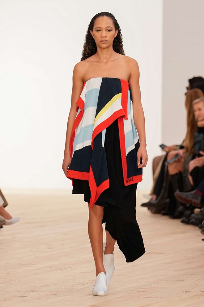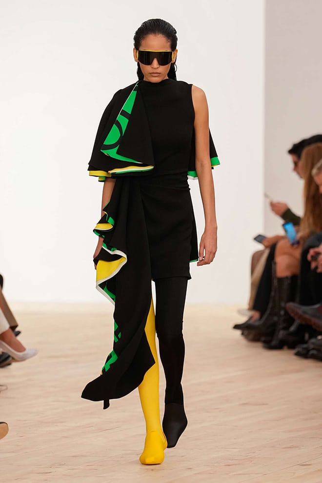 Pour leur première collection femme chez la griffe espagnole, le duo met l’accent sur le savoir-faire artisanal, et plus particulièrement sur le travail du cuir, avec des pièces rigides transformées en mini-robes, vestes et sacs spacieux. Pour contrebalancer cette structure, des robes fluides aux volants colorés, inspirées du flamenco, viennent apporter mouvement et légèreté.